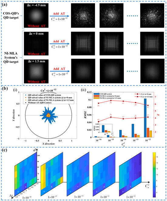 This subsection has verified the ability of the NI-MLA system to mitigate the SPDRE-QD under turbulence conditions and examined the influence of different system parameters on this mitigation effect. The SLM is loaded with the phase distribution that conforms to the Kolmogorov power spectrum. After being emitted from the collimator, the laser is reflected by the SLM, effectively simulating the distorted spot produced by 1 km laser propagation under different turbulence intensities in Table 3 (with each corresponding to 10,000 different shapes of distorted spots). Figure 12a shows images captured by replacing the QD target surface with a camera in both optical systems (parameters are shown in Table 1 and Table 3). By comparing the spot morphology of the two systems with or without turbulence input, it can be qualitatively observed that the NI-MLA system, after loading atmospheric turbulence (represented as AT in the figure), exhibits a significantly improved stability in spot energy distribution compared with the COS-QD.