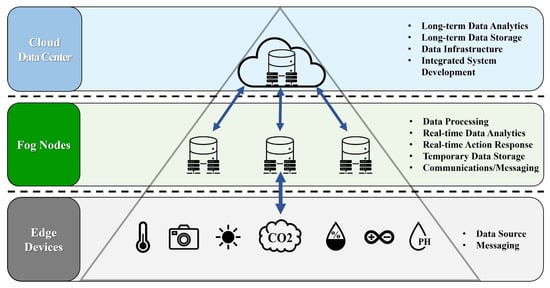 Fog computing, introduced by Cisco in 2012, comprises an intermediary layer between the cloud and end users (clients). This layer comprises fog nodes, including fortified routers and switches []. Cloud and fog computing possess distinct, complementary characteristics []. Fog computing represents an extension of cloud servers that aims to alleviate the computational load on these servers by supporting calculations and processing tasks within fog nodes []. Fog nodes are crucial in reducing the traffic burden on networks []. This is achieved by filtering, preprocessing, or compressing raw data, thereby enabling the transmission of smaller amounts of data to cloud servers []. This minimizes bandwidth consumption and ensures swift response times. Nonetheless, fog computing relies on cloud servers for intricate processing tasks []. Cloud servers offer additional computational resources to augment the required processing power. These distinctive attributes of fog nodes open diverse application fields that are particularly suited for managing distributed and real-time characteristics []. Figure 1 shows a system configuration diagram illustrating the fog computing architecture. The arrows indicate the flow of data from edge devices to fog nodes for immediate processing, and subsequent to the cloud data center for long-term analysis and storage.