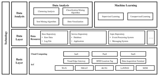 The system is composed of three major layers: the basic layer, data layer, and data analysis layer. The basic layer represents the infrastructure forming the foundation of the AIoT system. This includes cloud computing and IoT technology. The cloud computing section encompasses service models such as IaaS and PaaS. The IoT section consists of elements like virtual edge gateway and RFID location tag, along with various connectivity technologies. The data layer manages data resources and storage. There are three types of repositories in the data resources, each managing specific types of data and systems. The topmost data analysis layer consists of two main components: data analysis and machine learning. The data analysis section includes technologies such as clustering analysis, mining algorithms, and data visualization. This framework well illustrates the complexity and various components of AIoT systems. All layers from basic infrastructure to advanced analytics are organically connected, enabling effective support for the entire process from data collection, storage, and analysis to insight derivation in application areas such as smart farms. In smart farms particularly, these technologies can be utilized for crop growth monitoring, environmental control, yield prediction, etc., greatly improving agricultural efficiency and productivity.