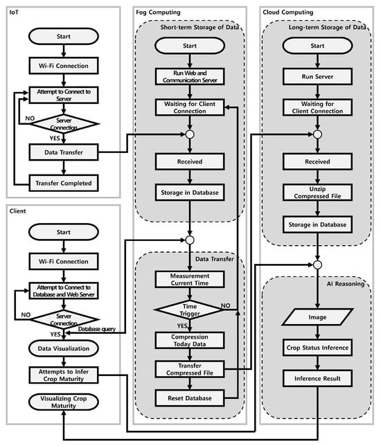Fog nodes play a crucial role in the system by storing IoT sensor data and images with minimal latency. To optimize network traffic, large volumes of sensor data and images collected throughout the day are compressed and filtered at the fog nodes. By extracting only essential information and transmitting a small amount of refined data to the cloud server, this process significantly reduces bandwidth usage and improves overall system efficiency. The fog nodes implemented in our system consist of a web server and a database. They act as a hub for IoT sensor data and field images, performing tasks such as data storage, compression, and transmission. The main functional modules of the fog nodes include an IoT sensor data management module, an image processing module, a data compression and transmission module, and a local analysis module. These modules are responsible for sensor data collection and visualization, image storage and processing, data compression and transmission management, and basic data analysis and alert generation, respectively. The modular design of the fog nodes ensures system scalability and flexibility. New sensor types or analysis algorithms can be easily integrated, and the system can be readily adjusted according to changes in farm scale or requirements. The implementation of this fog computing system greatly enhances the operational efficiency of smart farms, enabling real-time monitoring and rapid decision making. Additionally, by reducing cloud dependency, it contributes to improved data security and privacy.