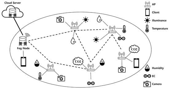 A fog computing system was implemented at a hydroponic coffee tree farm located in Siheung, Gyeonggi-do, Republic of Korea. Figure 5 shows a smart farm environment built based on fog computing principles. Three fog nodes were strategically installed to configure the distinct WMN. This setup connects the IoT sensors and cameras to a nearby WAP, enabling real-time data transmission to fog nodes.