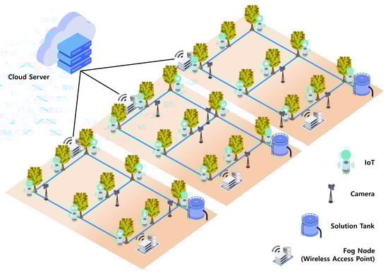 Internet of Things (IoT) technology is helping to collect and transmit data in various fields, bringing innovative changes to various aspects of modern society []. In particular, it is opening a new paradigm called smart agriculture in the agricultural sector. Smart agriculture aims to significantly improve the efficiency and sustainability of crop production by utilizing IoT technology. Currently, billions of IoT devices are connected to the internet, collecting and transmitting vast amounts of agriculture-related data in real time. However, this extensive data transmission causes problems that put considerable load on networks and cloud servers and consume bandwidth []. To address this, fog computing has emerged as a promising infrastructure for smart agriculture []. It represents a computing paradigm that supports computationally intensive and latency-sensitive applications of IoT devices that often have limited resources. This can effectively solve the computing and network bottlenecks of large-scale IoT applications. The main purpose of this study is to analyze in depth the benefits of integrating IoT and fog computing in a smart agriculture environment, thereby contributing to improving agricultural productivity and sustainability. Specifically, we propose a fog computing-based framework that efficiently processes and analyzes large-scale data generated by IoT devices in smart agriculture. Additionally, we evaluate the impact of the proposed framework on real-time monitoring and decision-making processes in farm operations, and analyze the performance of fog computing-based smart agriculture systems compared to traditional cloud-based approaches. Cloud computing and fog computing are complementary but have unique characteristics. Fog computing addresses typical issues of cloud computing such as data latency, lack of mobility support, and location awareness []. In the context of smart agriculture, this enables immediate decision making on the farm site and allows for rapid response to changes in crop conditions or weather conditions. Issues related to network bandwidth, latency, stability, and security due to the explosive growth of IoT are difficult to solve with the cloud model alone []. Fog computing addresses these issues while acting as an intermediate layer that collects, computes, and stores agricultural data generated by IoT devices before transmitting it to cloud servers. This allows for real-time analysis of various sensor data and information in smart farm systems to optimize crop conditions, weather conditions, and overall farm operations. The main contributions of this study are as follows. First, it accelerates the digital transformation of the agricultural sector by presenting an integration model of IoT and fog computing for smart agriculture. It also quantitatively evaluates the impact of the proposed model on agricultural productivity, resource efficiency, and environmental sustainability. Finally, it verifies the practicality and effectiveness of the proposed approach through case studies in actual farm environments. In a fog computing environment, IoT devices operate within a local area network (LAN) without the need to pass through a wide-area network (WAN), reducing network-related variables []. This is particularly important in smart agriculture, especially considering the limited network infrastructure in rural areas. Fog nodes efficiently compress agricultural data and transmit them to cloud servers only when necessary, minimizing network traffic and supporting real-time decision making. In conclusion, this study comprehensively analyzes the impact of integrating IoT and fog computing on smart agriculture, aiming to promote digital innovation in the agricultural sector. Our research results are expected to contribute to improving agricultural productivity, optimizing resource use, and ultimately, strengthening food security.