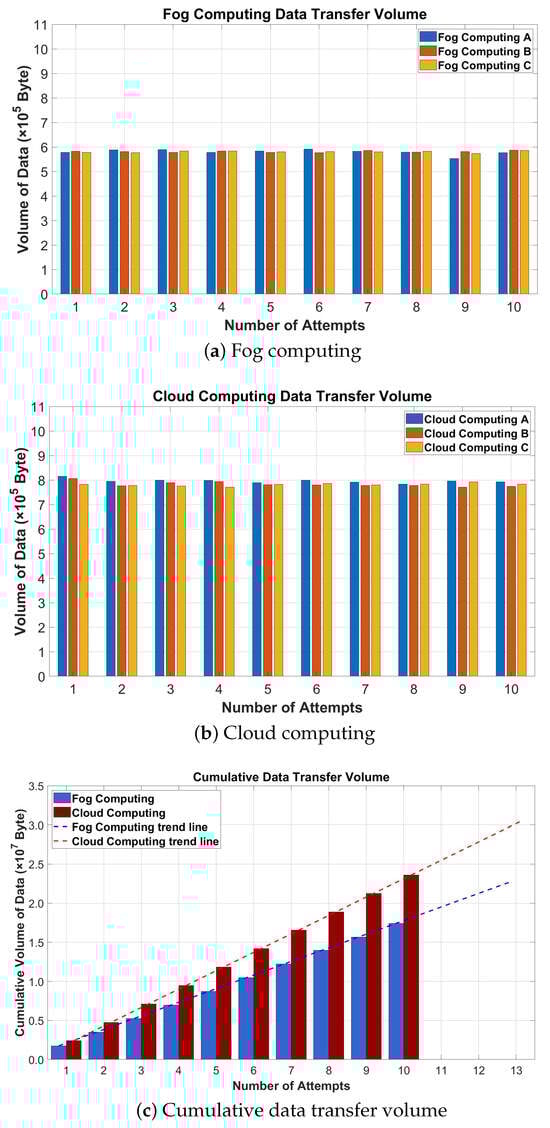 Figure 7 presents the results of the data transfer volume measurements conducted over 10 days in fog computing and cloud computing environments. Figure 7a shows the data volume measurements representing the compression of data acquired during the day from the fog node, which were then transmitted to the cloud server. Figure 7b illustrates the data volume measurements that depict the direct transmission of sensor data to the cloud server. Figure 7c shows the cumulative data volume from both (a) and (b), along with a trend line.