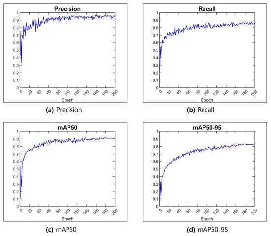 Equation (5) pertains to the intersection over union () and the mean average precision (). IoU represents the extent of distinction between true positives (s) and false positives (s) used in calculating precision in . It measures the ratio of the overlapping area of the actual object’s bounding box A and the bounding box predicted by the model B, to the sum of the areas of both bounding boxes. is one of the significant metrics in the domain of object detection. It represents the mean of average precision (AP), signifying the average across all classes and also the average over a specific range of the . A higher value indicates superior model performance. Here, denotes for class c, and represents for class c. Generally, is set to 0.5 when calculating , denoted as or mAP50. The measurement of over a specific range primarily uses 0.5–0.95, denoted as mAP50-95.