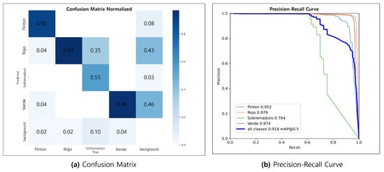 Figure 9 presents the confusion matrix (a) and precision–recall curve (b), which further demonstrate the model’s detailed performance. The confusion matrix analysis shows high accuracy of 0.97, 0.96, and 0.90 for the ‘rojo’, ‘verde’, and ‘pinton’ stages, respectively. The ‘sobremaduro’ stage has an accuracy of 0.55, which can be attributed to the subtle visual differences between it and the ‘rojo’ stage. This indicates the model’s ability to detect fine changes in the continuous maturation process. In the precision–recall curve, the ‘rojo’ (0.979), ‘verde’ (0.974), and ‘pinton’ (0.952) stages exhibited near-perfect performance, and even the ‘sobremaduro’ stage achieved a respectable score of 0.764. The overall mAP@0.5 for all classes was 0.918, confirming that the model maintained a consistently high level of accuracy. These results demonstrate that our model is highly effective at accurately classifying the maturity stages of coffee fruits. The high accuracy—above 0.90 in most stages—assists in predicting the optimal harvest time in real agricultural settings, helping to reduce potential losses due to misidentification.