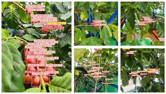 In the context of smart farming, this system was employed to determine the maturity of coffee tree fruits. This maturity was classified into four stages: ‘pinton’, ‘verde’, ‘rojo’, and ‘sobremaduro’. Pinton represents an immature state, while verde signifies an immature but progressing stage. Rojo indicates maturity, and sobremaduro denotes an over-ripe condition. The dataset used for this task was obtained from Roboflow [] and comprised 200 images. These images include coffee trees from actual farms and natural environments.