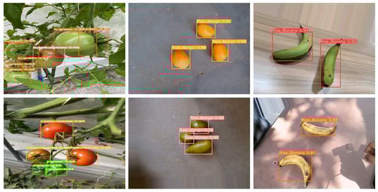 Figure 11 shows inference result images for mango, banana, and tomato. These are example results from test images in the dataset. They are classified based on the maturity of the fruit, showing high reliability and results.