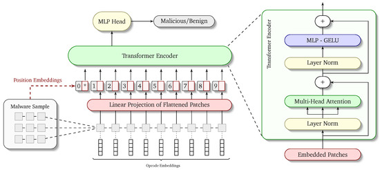 Figure 2. There are two important aspects needed to fully understand the working of ViTDroid: (1) the input to the model in terms of embedded and positionally encoded opcode sequences and (2) the modifications required in the vision transformer model to accommodate our inputs. We describe both of these in the corresponding sections below.
