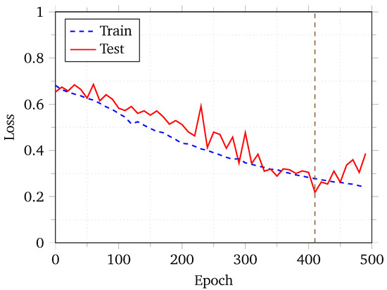 Figure 5. We ran our model for more than 500 epochs, which grew very steady, and then presented a slow decrease in loss for the first 100 epochs. Afterwards, the neural net seemed to have found a minima and the training loss decreased rapidly until the 400th epoch. After that, while the training loss decreased, the test loss started to increase. Our early stopping mechanism stopped the training at approximately 500 epochs. We used a model checkpoint created at the 410th epoch to calculate the rest of the metrics discussed below.