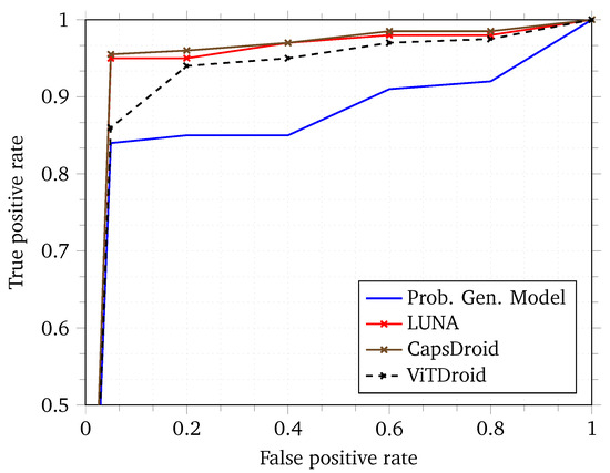 45]. As can be seen, ViTDroid performs quite well as compared with previous works. We note that while the false positive rate is high in most cases for ViTDroid when compared to some of the previous works, the delta is quite small. Moreover, the focus of our model is not only on a high AUC but also on explainability. None of the other models achieve this goal of explainability. We believe that the tradeoff between explainability and the AUC is an acceptable one since this can lead to an improvement in future models through further research insights gained through the explainability aspect of our model.