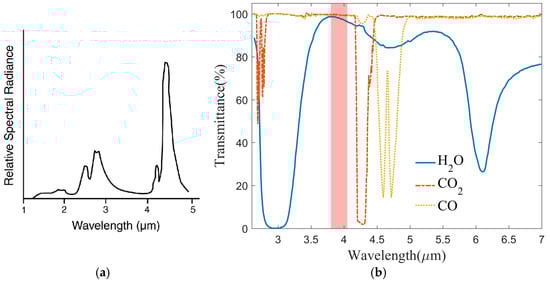 Integrating these studies indicates that the flame spectrum predominantly arises from the molecular radiation of H2O and CO2 present in the combustion byproducts. Figure 1a, cited from the work of Underhill-Shanks K. et al. [], shows an infrared spectrum obtained from a Bunsen burner. Both the H2O and CO2 bands are present in this figure. Figure 1b illustrates the infrared spectrum of several gas molecules within the mid-infrared wavelength range. The data come from the HITRAN2020 molecular spectroscopic database []. From Figure 1b, it can be seen that the high transmittance is aligned with the low spectral radiation shown in Figure 1a. Notably, Figure 1 indicates a radiation window, marked with a red column, where there is minimal absorption of H2O and CO2 gasses within this specific wavelength range.