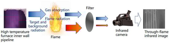 High-temperature furnaces and coal-fired boilers are widely employed in the petrochemical and metal-smelting sectors. Over time, the deterioration, corrosion, and wear of pipelines can lead to equipment malfunctions and safety incidents. Nevertheless, effective real-time monitoring of equipment conditions remains insufficient, primarily due to the interference caused by flames generated from fuel combustion. To address this issue, in this study, a through-flame infrared imager is developed based on the mid-wave infrared (MWIR) radiation characteristics of the flame. The imager incorporates a narrowband filter that operates within the wavelength range of 3.80 μm to 4.05 μm, which is integrated into conventional thermal imagers to perform flame filtering. This configuration enables the radiation from the background to pass through the flame and reach the detector, thereby allowing the infrared imager to visualize objects obscured by the flame and measure their temperatures directly. Our experimental findings indicate that the imager is capable of through-flame imaging; specifically, when the temperature of the target exceeds 50 °C, the imager can effectively penetrate the outer flame of an alcohol lamp and distinctly capture the target’s outline. Importantly, as the temperature of the target increases, the clarity of the target’s contour in the images improves. The MWIR through-flame imager presents considerable potential for the real-time monitoring and preventive maintenance of high-temperature furnaces and similar equipment, such as detecting the degradation of refractory materials and damage to pipelines.