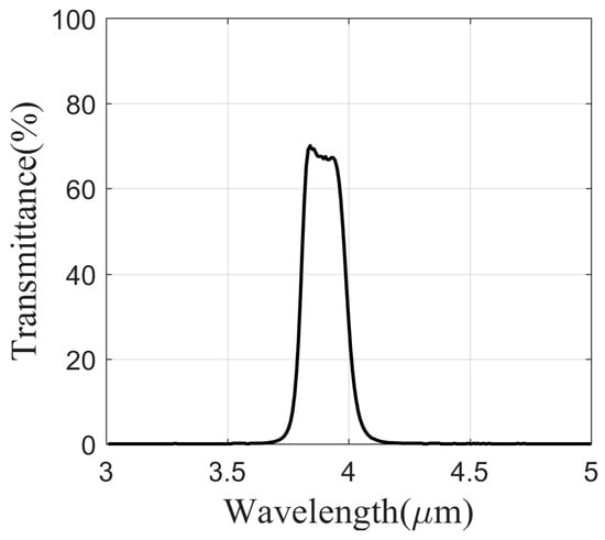 where and are the cut-off wavelengths of the filter. As shown in Figure 1, the weak absorption band near 3.90 μm, which corresponds to the low-radiation band, is highly effective for detecting targets hidden by flames. In the process of selecting the filter range, it is essential to maximize the filter width while simultaneously excluding the primary radiation of the flame. This approach optimizes the utilization of radiation energy and enhances the signal-to-noise ratio in imaging. In the present study, the filter bandwidth was established to be between 3.80 and 4.05 μm, effectively circumventing the absorption peaks associated with water vapor, C-H bonds, and SO2 gas present in the flame. Figure 3 shows the transmittance curve of the flame filter, and the performance details are listed in Table 1. The center wavelength is located at 3.92 μm, with a peak transmittance of 70%. The selection of a lower transmittance is primarily aimed at diminishing the intensity of incident radiation; thereby, the imager is suitable for measuring high-temperature objects.