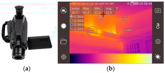 The FG390 camera (a) and its infrared image with temperature measurement (b).