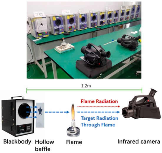 The effect of MWIR through-flame imaging is influenced by several variables, including the temperatures of the target, the flame, and the background, the detection distance, as well as the particulate matter within the flame. In the case of pure flames, the flame and target temperature are the primary factors affecting the through-flame effect. Despite the capability of through-flame imaging to circumvent the peak radiation zone of the flame, the high temperature of the flame can still obscure the radiation from a low-temperature background, thereby complicating the penetration of the flame. In this research, we performed an experiment utilizing the FG390 MWIR imager. The experimental setup involved a blackbody and a hollow board serving as detection targets, with a flame produced by an alcohol lamp. The thermal imager and the targets were aligned at the same height, and the thermal imager was situated 1.20 m away from the targets. The configuration and scene of the experiment are illustrated in Figure 5. The background temperature plays a crucial role in determining the infrared radiation intensity of the targets. During the experiment, we varied the temperature of the blackbody from 20 °C to 300 °C, selecting eight distinct temperature points for analysis. Additionally, a standard visible-light camera and a mid-wave cooled (wide-band imaging) camera were employed for comparative purposes.