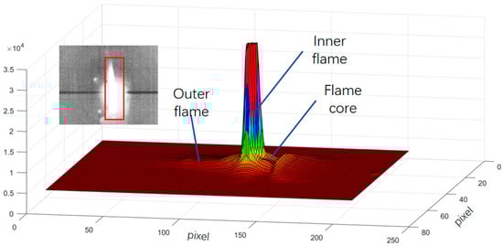 The flame produced by the alcohol lamp can be categorized into three distinct regions: the flame core, the inner flame, and the outer flame. Among these, the inner flame exhibits the highest temperature, while the flame core has the lowest temperature. During the experimental procedure, the flame height was measured to be between 4 and 5 cm, with the temperature of the inner flame ranging from approximately 400 to 500 °C. Additionally, the outer flame displayed a slight oscillation of 1 to 2 cm, attributed to disturbances in the indoor air environment. The outer flame emits a color of orange-yellow within the visible-light spectrum; therefore, in this investigation, the target was positioned behind the outer flame at an appropriate imaging angle to facilitate a comparison with visible light. Figure 6 illustrates the three-dimensional distribution of the infrared raw data following the application of a flame filter, revealing a significant reduction in the energy of the outer flame post-filtering. The raw data refer to the 14-bit digital number (DN) values that have undergone non-uniformity correction and temperature calibration but have not yet been converted into 8-bit image data.