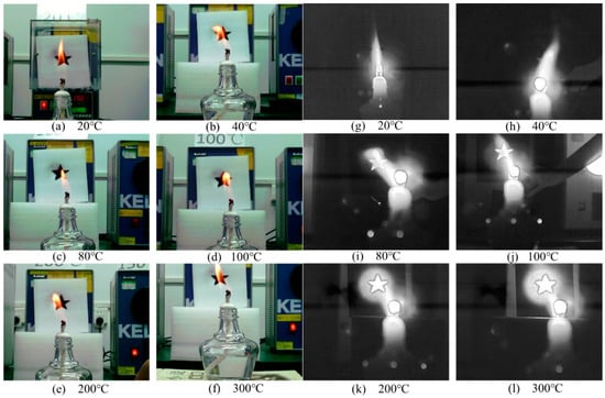 The visible-light images (a–f) and infrared images (g–l) at different target temperatures of 20 °C to 300 °C.