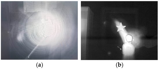 The wide-band thermal imagers capture higher radiation energy compared to the through-flame thermal imagers equipped with a flame filter. Thus, the data obtained from wide-band thermal imagers are prone to saturation when hot objects are present. In the conducted experiment, the integration time of the wide-band thermal imager was minimized, and the uniformity coefficient was calibrated using a two-point correction method. Figure 8a illustrates the imaging results from the wide-band thermal imager. As can be seen from the figure, the intense temperature of the flame causes the energy radiation from the flame to dominate the image, obscuring the target located behind it. Conversely, Figure 8b depicts the through-flame image, which, after applying flame filtering, can discern both the flame and the target situated behind it more effectively.