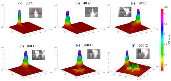 Six 3D views at different temperature levels, illustrating the variations in the raw data (digital number value) across the 80 × 80 pixel area of the alcohol lamp’s outer flame and the target.