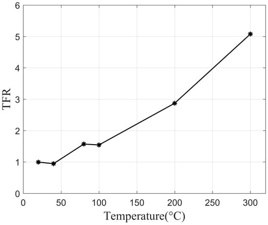 where and represents the average gray values of the targets and outer flame, respectively. When is more than 1, the radiation of the flame will not easily be able to mask the radiation from the target. The higher the value of , the greater the difference in the image, which indicates that the through-flame imaging is more effective. The TFR at six selected temperatures is shown in Figure 10. The inflection points in Figure 10 represent the TFR values at six selected temperatures, respectively. The TFR value increases significantly with the target temperature. When the temperature is below 50 degrees Celsius, the TFR value is around 1, indicating that the radiation of the background and the flame is comparable at this temperature. When the background temperature rises to 200 degrees Celsius, the radiation intensity of the target detected through the flame is 2.9 times that of the flame radiation. As the temperature rises to 300 degrees Celsius, the difference in radiation intensity approaches 5.1 times.