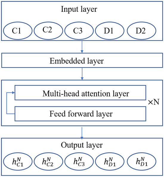The encoder architecture in EMADRL, as depicted in Figure 2, is comprised of several integral components: an input layer, an embedding layer, N attention modules, and an output layer. The input layer accommodates the customer nodes as well as the distribution center node, while the output layer generates a high-level feature representation that encapsulates both individual node attributes and overarching graph feature information. Within the N attention modules, each module maintains an identical structural configuration but operates with independent network parameters. Each attention module consists of a multi-head attention layer (MHA) and a feed-forward layer (FF), facilitating the encoder’s ability to effectively capture individual node characteristics alongside the broader relational dynamics within the graph. This design enhances the model’s capacity for a nuanced understanding of the system’s underlying dynamics and interactions.