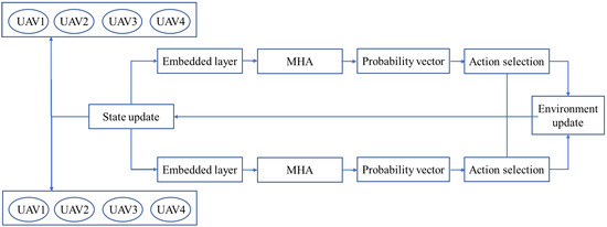 As each route state selection of distribution drone is not continuous but discrete, we should build a mathematical model for the random state transfer, discrete traveling state, and action selection mechanism of drones according to reinforcement learning. First, the multi-agent reinforcement learning form of MDVRP is defined; second, a strategy network based on the encoder–decoder structure is designed, and the network model is trained by the strategy gradient reinforcement learning method; third, different action selection strategies and search strategies are adopted to obtain higher-quality solutions.