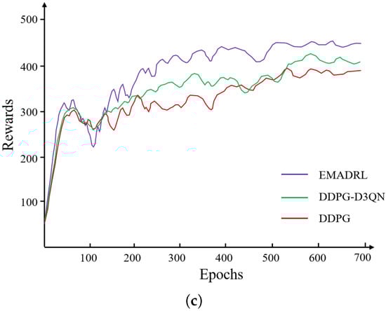 Figure 4 presents the typical deep reinforcement learning curves for the EMADRL, DDPG-D3QN, and DDPG algorithms. The reward curve of the agent exhibited fluctuations and an upward trend, indicating the adaptive adjustment of action selection strategies based on accumulated learning experiences. Initially, the EMADRL curve demonstrated significant fluctuations, which could be attributed to lower Q-value estimation accuracy during the early stages of training. However, as training progresses, the acquisition of more effective strategies led to stabilized fluctuations, underscoring the convergence and precision achieved by both deep reinforcement learning methods.