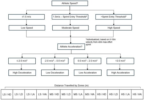 The use of these zones is consistent with previous studies in team sports linking movement speed, and acceleration/deceleration zones to performance demands from soccer, field hockey, and men’s rugby union fifteens and sevens [17,27,28]. Distance travelled, in metres, was divided into three speed-zones: low speeds (walking—0–1.5 m/s), moderate speeds (running—1.5 m/s to each athlete’s entry to sprinting threshold), and high speeds (sprinting-entry to sprinting and above), expressed relative to each athlete to ensure appropriate reflection of the individual efforts of each athlete [29,30]. The use of three zones represents an efficient combination of the traditional five-zone division available in team sport GNSS systems, intended to offer an applied workflow where movements are easy to identify, and communication of results to coaches is efficient in plain language [31,32,33]. Furthermore, each athlete’s entry to the sprinting threshold was individualized based on the athlete’s velocity achieved from 0 to 10 m of a maximal effort 40 m sprint performed in training and updated regularly throughout the season to ensure accuracy over periods of physical development [29,34].