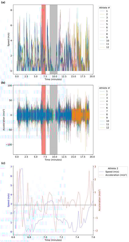 Sample sensor data from one match showing: (a) all athlete speeds, (b) all athlete accelerations and decelerations, and (c) a single athlete subset for a one minute period of play. The grey shaded box in (a,b) denotes the two minute halftime period of the match, where players remain on field. The red shaded box in (a,b) denotes the subset time period in (c). The dashed line in (c) denotes a zero acceleration, above this line are positive accelerations and below are negative accelerations or decelerations.