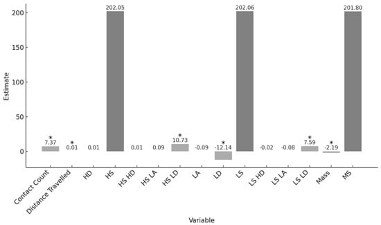 The model results showed a significant main effect of mass, t(18) = −5.27, p < 0.01, distance travelled, t(18) = 5.54, p < 0.01, contact count, t(18) = 57.05, p < 0.01, and low decelerations, t(18) = −4.60, p < 0.01. Furthermore, significant interaction effects were demonstrated between low deceleration and low speed, t(18) = 3.05, p < 0.01, and low deceleration and high speed, t(18) = 3.78, p < 0.01. However, there were no significant main effects for accelerations at any speed, p > 0.01.