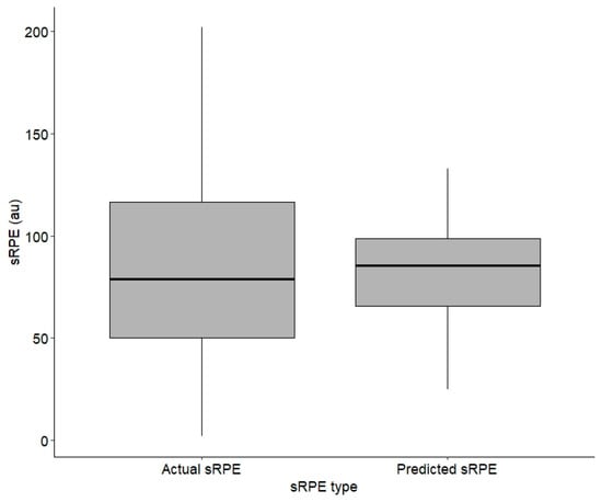 As a means to evaluate the practical applications of the LMM-predicted workloads, the dataset was used to assess the association between workload and game number within a tournament. Rugby sevens tournaments take place over two or three consecutive days, with teams playing five or six games [35]. One repeated-measures ANOVA was performed, to evaluate the association between the sRPE values (actual or LMM-predicted) and the game number within a tournament by the player using R statistical software (version 4.2.1, Vienna, Austria).