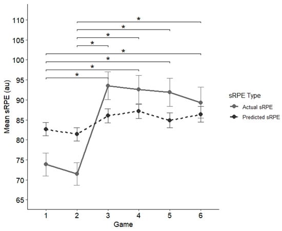 There was also a significant interaction effect between game number and sRPE type, F(5, 1974) = 8.41, p < 0.01, accounting for within-player effects (Figure 6). Pairwise comparisons were performed to assess the differences between the sRPE type (actual and predicted) by game number (1–6), and significant differences were identified between the sRPE type at games number 1, 2, 3, and 5 (p < 0.01).