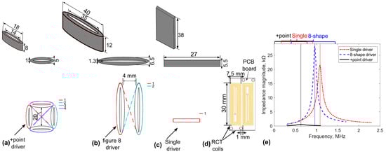 To optimise the performance under the distributed magnetic field of the transmitter coil, it is recommended that the width of the coil be equal to or exceed the length of the receiver coil. Increasing the number of turns in the transmitter coil strengthens the magnetic field but raises the inductance, consequently lowering the resonance frequency. The fabrication of transmitter coils with 62, 72, and 66 turns on ferrite, corresponding to single, +point, and figure-8-shaped configurations, respectively, ensures the generation of a suitably robust magnetic field to produce the desired excitation frequency signal. Table 1 provides transmitter and receiver coils’ parameters. The peak frequencies of the transmitter coil vary based on winding quality and turn count. Figure 3a–c show +point, figure-8-shaped, and single winding methods, respectively, along with their dimensions and resonance frequencies. The transmitter coils’ impedance spectra were assessed employing a Network Analyzer (TE3001, TrewMac Systems Ptd Ltd, Morphettville, Australia). Resonant frequencies of approximately 1.1, 0.6, and 1 MHz were observed for the single, +point, and figure-8-shaped transmitters, respectively.