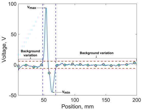 Data collection began from 0 to 50 mm over a large, non-damaged area of the rail track (as shown in Figure 5). These data are utilised for automatic calculation of twice the root-mean-squared (RMS) value of the background structural noise as a threshold to distinguish sensor signals (indicated by the horizontal dashed line in Figure 5). Any signal exceeding twice the mean RMS noise voltage is considered a sensor signal and undergoes peak value detection. Upon passing the defective zone, the algorithm automatically provides information about the estimated SNR calculated using Equation (2):
