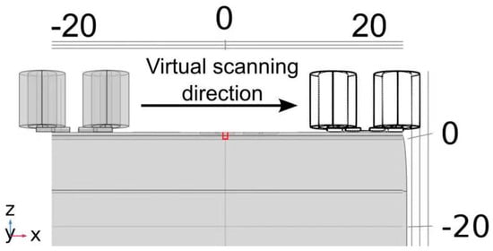 The virtual scanning model was executed employing COMSOL 6.1, as meticulously illustrated in Figure 6. The model spans the x-axis from −20 mm to 20 mm, encompassing both the defective area (ranging from −0.5 mm to 0.5 mm) and the surrounding non-defective zones, which exhibit structural variations. The detailed FEM setup parameters are presented in Table 3.