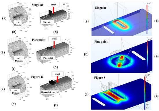 Figure 7i provides a comprehensive overview of the FEM mesh, delineating the air domain and transmitter coils within the “Singular”, “+Point”, and “Figure-8” configurations. Additionally, it includes a detailed close-up of the transmitter coils positioned adjacent to the rail defect. The resultant EC distributions generated by the “Singular”, “+Point”, and “Figure-8” configurations are depicted in Figure 7ii(a–c), respectively.