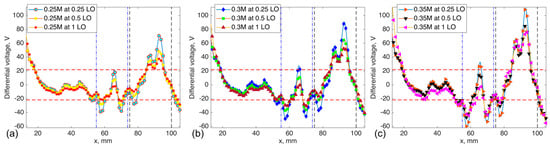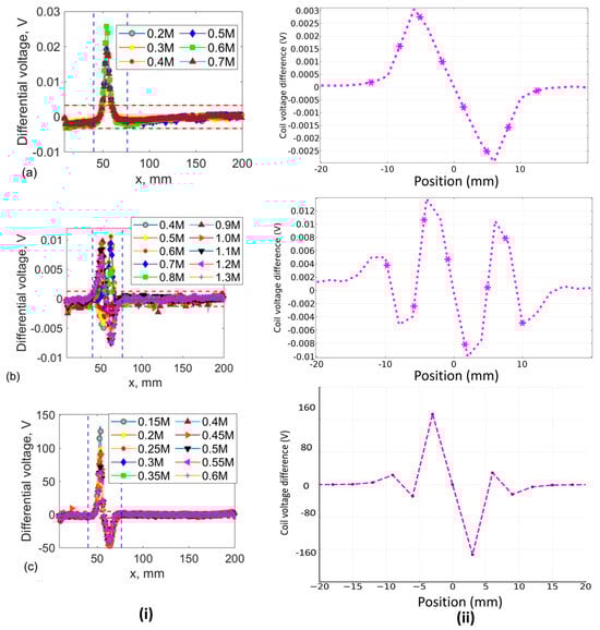 The experimental setup involved conducting at least three repeated independent measurements across a 200 mm range for each specimen to enhance precision in real time using MATLAB. The movement increment was set to 0.125 mm, resulting in a maximum of 1600 data points. The collected data underwent post-processing to detrend signal amplitudes, followed by smoothing using MATLAB’s built-in filtering and the subsequent calculation of the SNR.