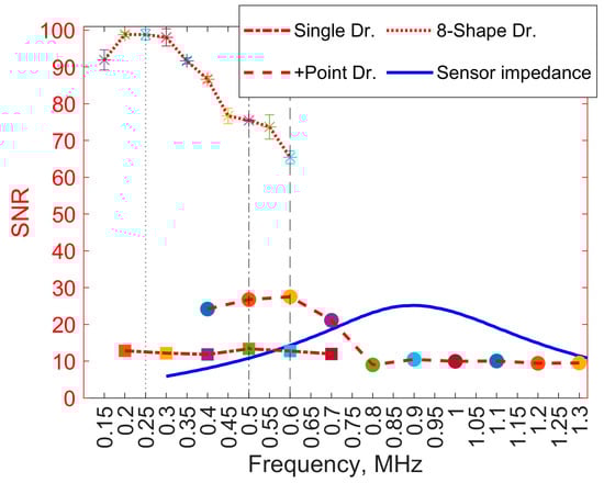 The sensitivity of the selected probe during scanning over each defect, along with its estimated SNR and the contribution of structural noise, were evaluated independently, as depicted in Figure 16. The estimated structural noise was relatively higher due to edge effects, resulting in lower SNR. Despite the noise level, the selected probe exhibited slightly better performance around 0.35 MHz, achieving SNRs of 7.5 and 12.5 for the first and second/third defects, respectively.