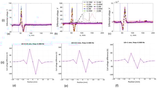 This approach is critical for future studies, where the integration of this probe configuration might be necessary under varying operational frequencies. MATLAB R2024a software was utilised to ensure real-time accuracy in data acquisition and analysis. Figure 11a–c present the selected probe sensitivity profile, demonstrating its differential voltage response as a function of varying lift-off distances. A notable trend observed was a significant decrease in the recorded differential voltage as the distance from the rail surface increased within the range of 0.5 to 1 mm. In addition to the experimental data, FEM simulations were conducted to assess the impact of lift-off distance on probe performance. The simulation results, presented in Figure 11d–f, demonstrate that the selected probe configuration exhibits a similar trend to the experimental results as the lift-off distance increases. A significant drop in differential voltage was observed at the maximum lift-off distance of 1 mm. To facilitate a quantitative comparison of the experimental results and assess the individual contributions of influential factors such as signal and coherent structural noise, the raw EC data presented in Figure 11 underwent further post-processing, following the methodology described by [].