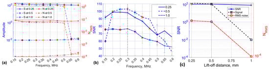 Performance assessment of EC probe with a figure-8 shaped transmitter across lift-off distances of 0.25 mm, 0.5 mm, and 1.0 mm: (a) separate contributions of signal (S) and noise (N) and (b) SNR across various frequencies; (c) average voltage and structural noise at optimum 0.3 MHz.