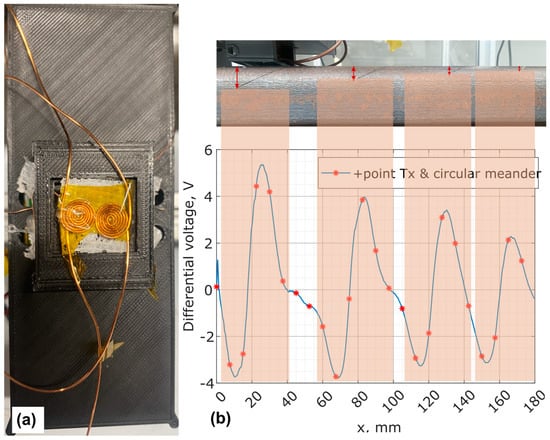 The initial EC probe design combined a +Point transmitter coil with two differentially hand-wound meander receiver coils. Initial tests used circular hand-wound differential coils before finalising the design on a PCB board with a 0.5 mm wire and a 6.5 mm coil diameter, as shown in Figure 13a. The measurement setup involved placing the sample on a vibrating linear stage while the EC probe remained static at a 1 mm lift-off. Despite inconsistencies in receiver coil design, preliminary results were promising. Stage vibration, caused by the sample’s weight after each movement increment, allowed only one repeat measurement, as shown in Figure 13b. The reduction in differential voltage was attributed to variations in the depth of artificially induced defects, with the lowest voltage corresponding to a defect depth of around 1 mm. Since the same Tx-dRx measurement mechanism was applied throughout all studies, this insensitivity to lift-off variation test results demonstrates the mechanism’s reliability, robustness, and effectiveness in real-world scenarios before dynamic testing.