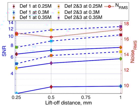 Understanding a selected probe’s sensitivity to targeted defects, particularly concerning variations in lift-off distance, is crucial before implementing the sensor in real-world settings. Previous studies consistently maintained a 0.25 mm distance across all measurements. However, in [] the research applied sensor integration in a similar environment with a 1 mm lift-off distance. Therefore, to explore probe sensitivity across a range of 0.25 to 1 mm, a minimum of three independent measurements were conducted, varying both frequency and lift-off distance. The rationale for maintaining a constant frequency range was to evaluate the noise level at different lift-off distances.