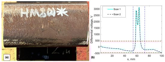 The experimental results from railroad inspection are crucial for validating the effectiveness of the selected EC probe. The results presented in previous sections are based on artificially induced defects in a material with an undamaged, high-quality surface. For this study, a real rail section with local damage, measuring 128 mm in length, was prepared. The material has a carbon content in the range of 0.87–0.97% by mass in its liquid state. In real rail sections with induced local damage, such as studs (see Figure 17a), major cracks develop in the direction of traffic, although the propagation mechanism remains under investigation. Some cracks form at approximately 20 degrees, but there is no consistent pattern, leading to variations in crack depth and angle along with high roughness in the undamaged areas of the specimen. The defects typically have a “U” shape and can penetrate to depths of 3–6 mm in the rail, and the defect formation is extensively studied in []. Studs pose a risk because the rail beneath them cannot be effectively tested using ultrasonic NDE from the running surface, except with specialised equipment [].