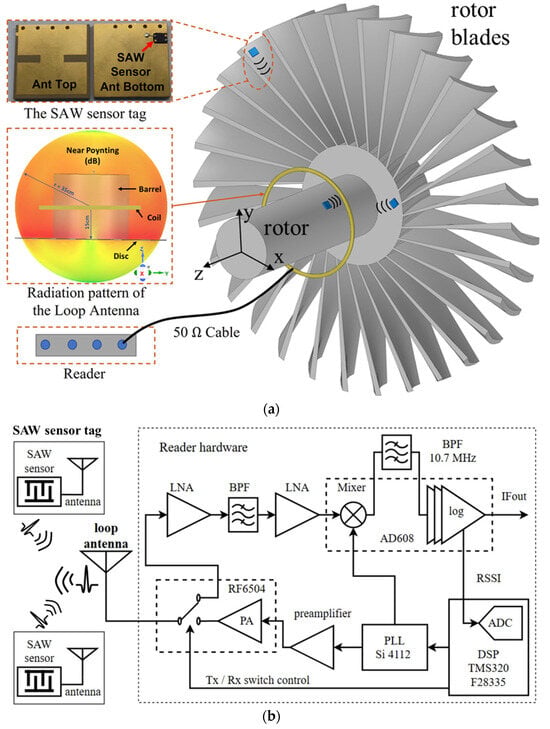 (a) System configuration diagram: installation of the loop antenna, SAW sensor tags, and reader; (b) Hardware architecture of the reader.