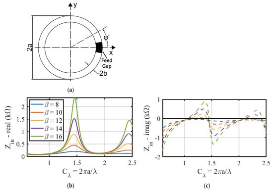 (a) The geometric dimensions of a loop antenna; Real (b) and imaginary (c) part of the loop antenna impedance in free space with different values of β and a normalized circumference Cλ.
