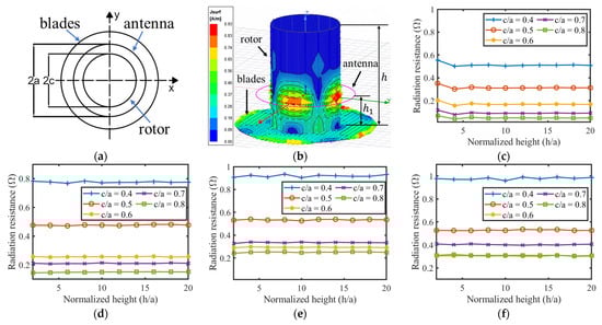 The curves in Figure 3c–e illustrate the relationship between antenna radiation resistance and normalized rotor height () at different values of normalized rotor radius (). In order to compare these with the loop antenna in free space, the results of simulated radiation resistance are normalized by the values in Table 1. All four figures with present in a horizontal strip distribution, meaning that the antenna radiation resistance is not sensitive to the height of the turbine rotor. The antenna radiation resistance presents a gradually decreasing trend with the growth of , showing that the rotor radius is the main factor determining the antenna radiation resistance.