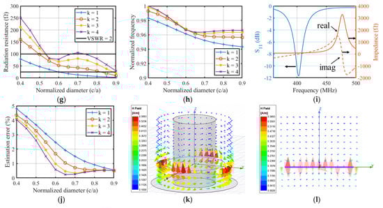 (a) The top view projection and (b) the three-dimensional view of the simulation model together with the simulated surface current distribution of the model when ; (c–f) The relationship between normalized antenna radiation resistance, rotor height (), and rotor diameter () of four loop antenna with , respectively; (g) Antenna radiation resistance and (h) normalized antenna self-resonant frequently at different normalized rotor diameters (); (i) Simulated return loss ( parameter) and impedance spectrum ( parameter) of the 400 MHz loop antenna integrated with a rotor; (j) Estimation error of Equation (4) for the loop antenna integrated with the rotor model; Magnetic field distribution around the loop antenna (k) with the rotor model and (l) without the rotor model when .
