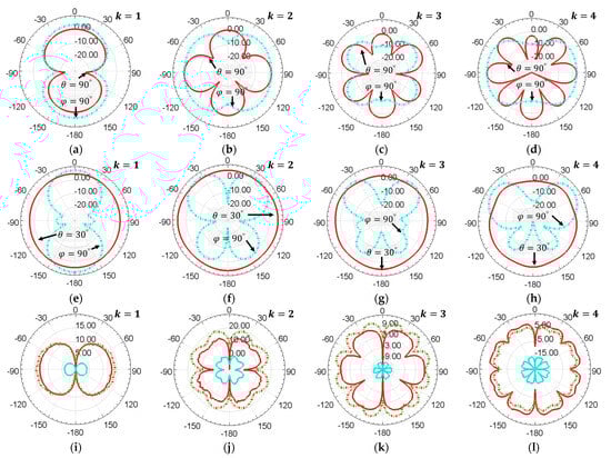 The far-field gain in decibel units on the azimuth angle (red solid line) and the elevation angle (blue dot dash line) of the loop antenna are displayed in Figure 4a–h. The radiation pattern of the loop antenna in the free space at in Figure 4a is complementary to that of a dipole antenna. The radiation patterns for the loop antenna in free space in Figure 4a–d show that with the increase in , more sidelobes appear due to the multiple oscillation cycles of current distribution on the loop antenna. The radiation patterns for the loop antenna with turbine rotor in Figure 4e–h show that the antenna beam angle becomes larger with the increase in due to the sidelobes merging together. Comparing the radiation patterns in Figure 4a–d, the turbine rotor and blades increase the antenna gain and directivity. The value of the maximum far-field gain and its position in spherical coordinate units are listed in Table 4, demonstrating that the gain of the loop antenna integrated with a turbine rotor is several decibels higher than the antenna in free space.