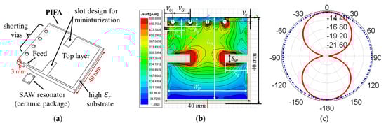 In addition to the antenna gain and bandwidth, stability for operating in complex metal environments is also another important consideration in this sensing system. The impedance of the helical antenna and dipole is hard to optimize because it varies a lot in different metal environments, while PIFA works stably in such environments. Furthermore, PIFA is the best miniaturization design among the listed antenna types, although its gain is sacrificed. Although PIFA has less bandwidth than other types of antennas, it is adequate for covering the wide temperature sensing range of our SAW sensor. This is analyzed in detail in Section 3. The design architecture of PIFA used in this work is displayed in Figure 5a, where the top layer graphic was formed by etching on a double-sided copper-clad ceramic substrate and the SAW resonator was embedded in the bottom side of the PIFA substrate.