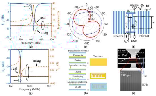 where is for typical RF systems, is the system operating frequency already determined by the turbine rotor radius, N is the number of IDT pairs, and are the material constants of the electromechanical coupling coefficient and unit capacitors, respectively. The design was then verified by simulating the impedance spectrum using the acoustic propagation matrix; the results are presented in Figure 5g.